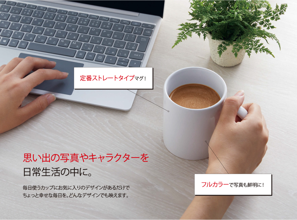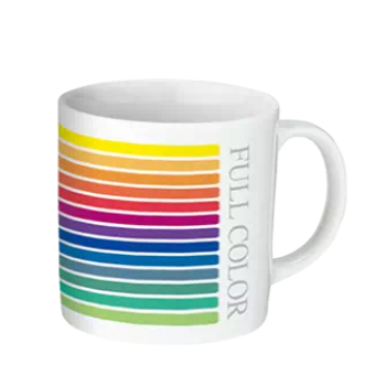 昇華転写に対応した陶器のカップであれば、製版が必要ないので少ない数から製作ができます。フルカラー対応なので複雑なイラストや写真まで鮮明に印刷が可能です。
