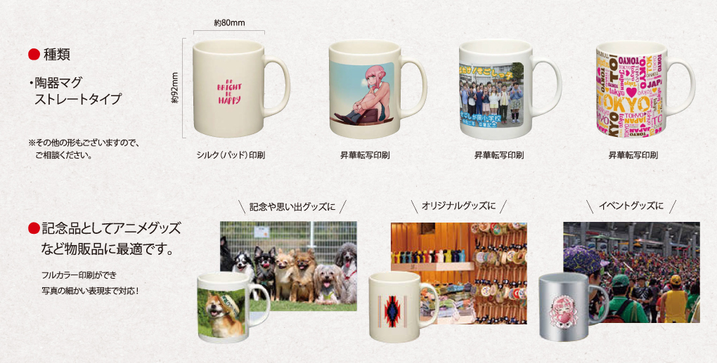 ※カップやグラスは専用カタログからお選びいただけます。 - 印刷方法:昇華転写プリント、シルク印刷