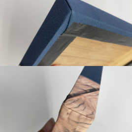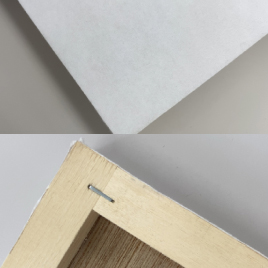 木製のパネルをフレームに用います。フレームの四隅はタッカーで打ち込みます。表にも板を貼り合わせることで高い強度のフレームを作成できます。表面に和紙貼りを施します。理由としてファブリックの柄や厚さによっては下地の板の模様が浮き出てくることがあります。和紙貼りをすることによって、生地本来の色味や柄を表現可能となります。